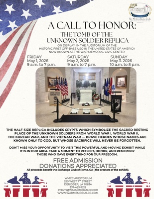 The Tomb of the Unknown Soldier Replica will be on display at the War Memorial Civic Center Auditorium—the historic first off-base USO in the United States.